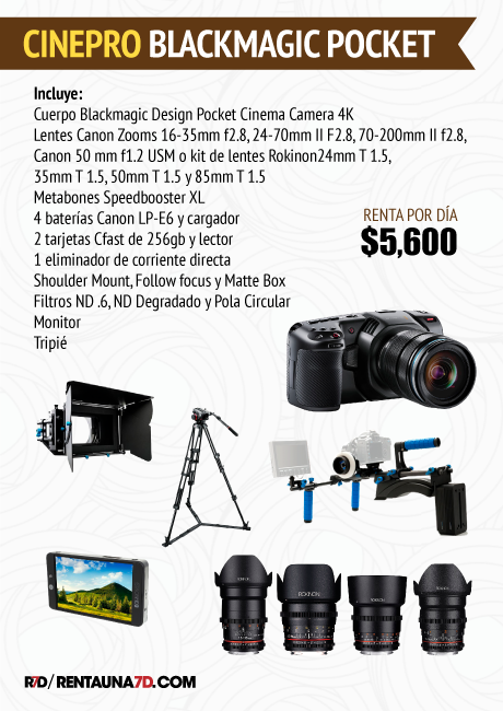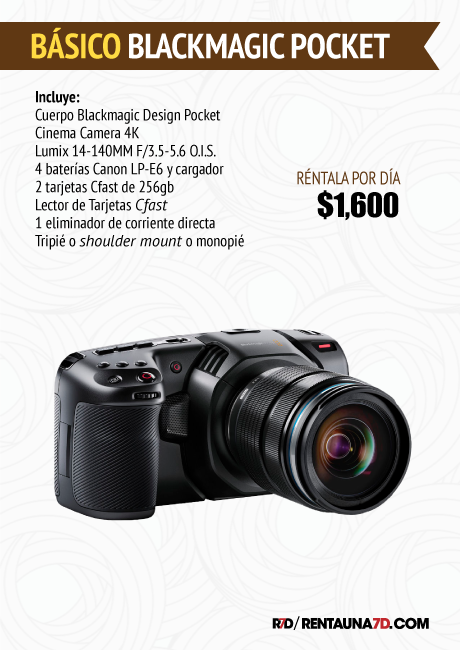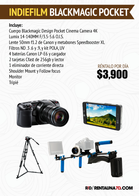 La Pocket Cinema Camera 4k de Blackmagic Design posee un sensor de Micro 4/3 y graba DCI 4K hasta 60 fps en: Blackmagic Raw y varias opciones de ProRes 422. Además graba 120 fps en Full HD (recortado). Su montura de lente Micro Four Thirds le permite usar óptica más económica y ligera, aunque puede usar óptica EF con el Metabones Speedbooster y mantener el look Full Frame. Tiene ISO doble nativo de hasta 25,600 para la captura con poca luz y 13 pasos de rango dinámico para imágenes HDR.