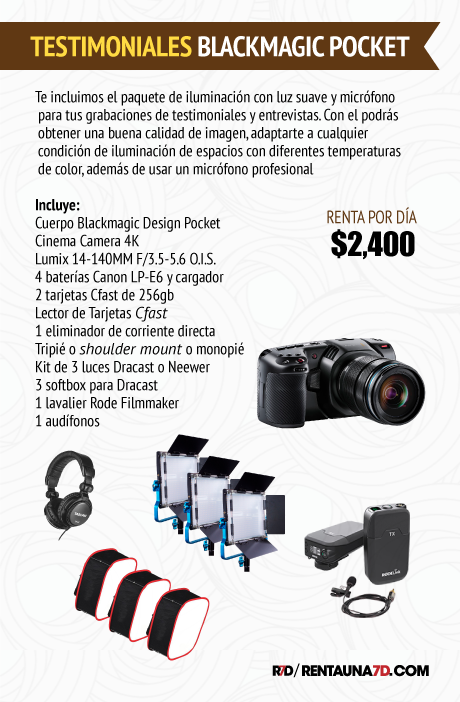 En audio posee entrada mini-XLR mono con phantom power, que permite alimentar un shotgun directamente a la cámara. Además tiene entrada miniplug de 3.5mm estéreo para conectar un lavalier (puedes utilizar ambos puertos simultáneamente). Tiene control remoto Bluetooth para control con la aplicación de Blackmagic Design. Aunque puede usar batería tipo Canon LP-E6 (40 mins), también puedes conectar la cámara a corriente directa con su eliminador incluído o bien usar el grip que te permite usar 2 baterías tipo Sony NP f550 para una duración máxima de 2 horas.