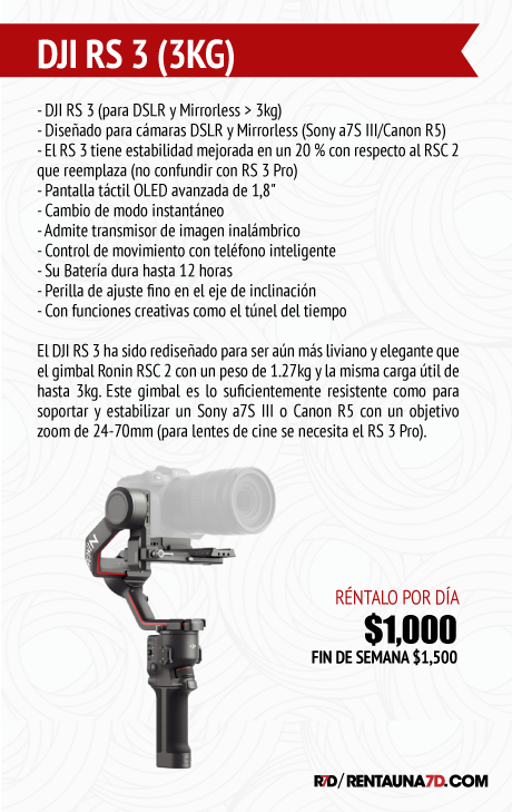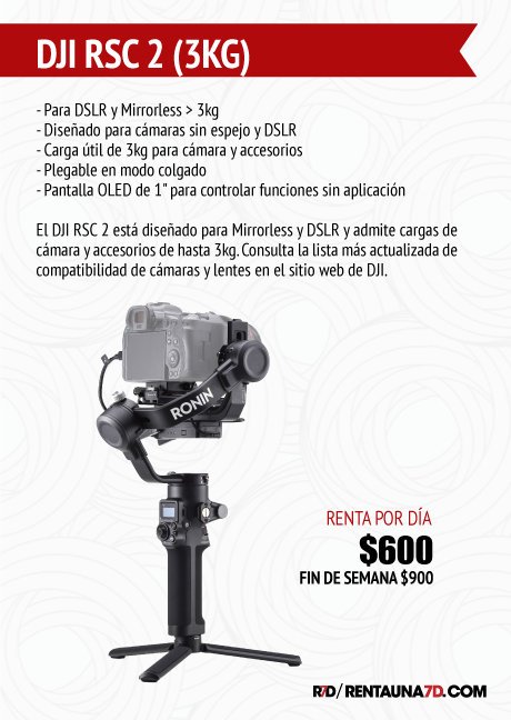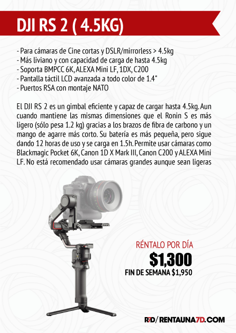 El DJI RS 2 es un gimbal eficiente y capaz de cargar hasta 4.5kg. Aun cuando mantiene las mismas dimensiones que el anterior Ronin S es más ligero (sólo pesa 1.3 kg) gracias a los brazos de fibra de carbono y un mango de agarre más corto. Su batería es más pequeña, pero sigue entregando 12 horas de uso y se carga en sólo 1.5h. Permite usar cámaras Mirrorless incluyendo la Blackmagic Pocket 6K Pro y cualquier DSLR incluyendo la Canon 1D X Mark III (*).