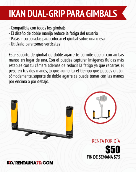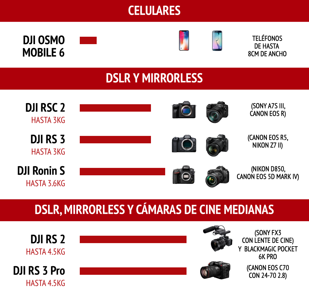 Se puede montar DSLR y Mirrorless. Acepta cámaras altas como la 1DX Mark II y también soporta la Blackmagic Pocket en su versión 4k, 6k y 6k Pro.