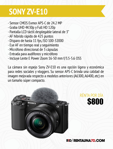 La cámara sin espejo Sony ZV-E10 es una opción ligera y económica para redes sociales y vloggers. Su sensor APS-C brinda una calidad de imagen mejorada respecto a modelos anteriores (A6300, A6400, etc) en un tamaño súper compacto.