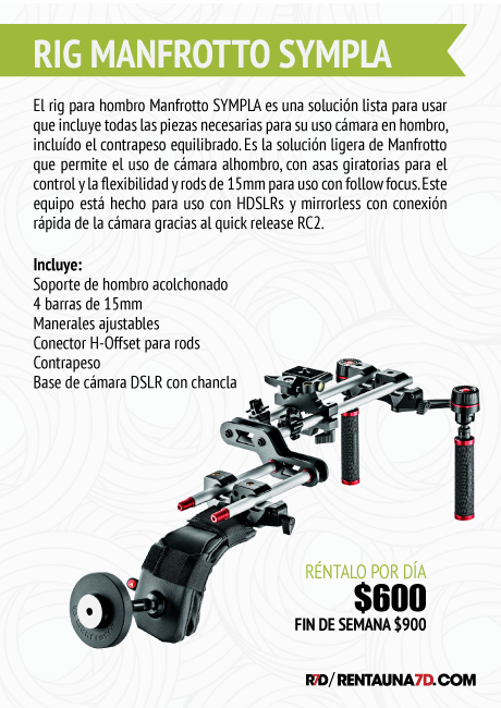 El diseño del rig sitúa la cámara frente a tu rostro lo que te permite tener una mejor visión de la pantalla. Tiene un contrapeso incluído que hace que tu cámara esté balanceada en tu hombro y elimina la fatiga de cargar un rig convencional. Tiene rods estándar de 15mm para incluirle accesorios como follow focus y mattebox.