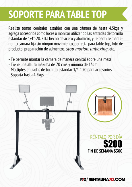 Realiza tomas cenitales estables con una cámara de hasta 4.5 kg y agrega accesorios como luces o monitor utilizando las entradas de tornillo estándar de 1/4"-20. Esta hecho de acero y aluminio, y te permite mantener tu cámara fija sin ningún movimiento, perfecta para table top, foto de producto, preparación de alimentos, stop motion, unboxing y un largo etcétera. Su diseño con patas y una barra central permiten mantener la cámara fija, lo que da la posibilidad de hacer tomas con continuidad de cuadro. La plataforma se puede desmontar y volver a montar fácilmente, lo que la hace ideal para espacios más pequeños o viajes.
