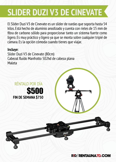El slider soporta hasta 20 kg en horizontal, 14 kg cuando está inclinado a 45° y 6.3 kg en vertical. El carro integra un tornillo de 3/8"-16 para cabezales y accesorios, mientras que la base ofrece roscas de 1/4"-20 y 3/8"-16 para montarlo en tripié. Sus