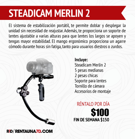Diseñado por Garrett Brown, el sistema Steadicam Merlin 2 es un estabilizador de gimbal de mano ligero que obtiene resultados rápidos, sencillos y profesionales en diversas situaciones, sin necesidad de sistemas electrónicos que requieren baterías. Pesa sólo 640 gramos y soporta cámaras de hasta 2.27kg.