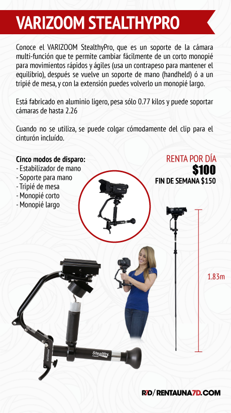 El mango ergonómico proporciona un agarre cómodo durante horas sin fatiga, tanto para usuarios diestros o zurdos. El soporte del lente se ajusta a varias alturas y ángulos para soportar lentes largos con el cuerpo de la cámara. Incluye maleta pequeña o bien dóblalo y transpórtalo junto con otros equipos