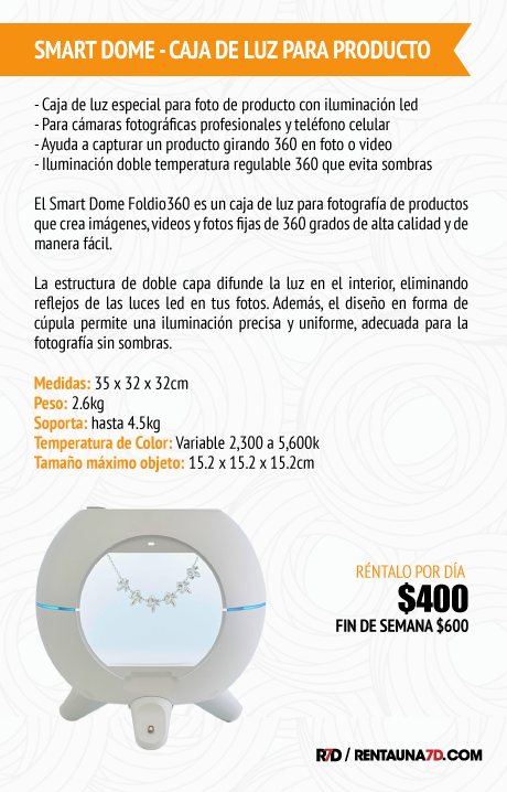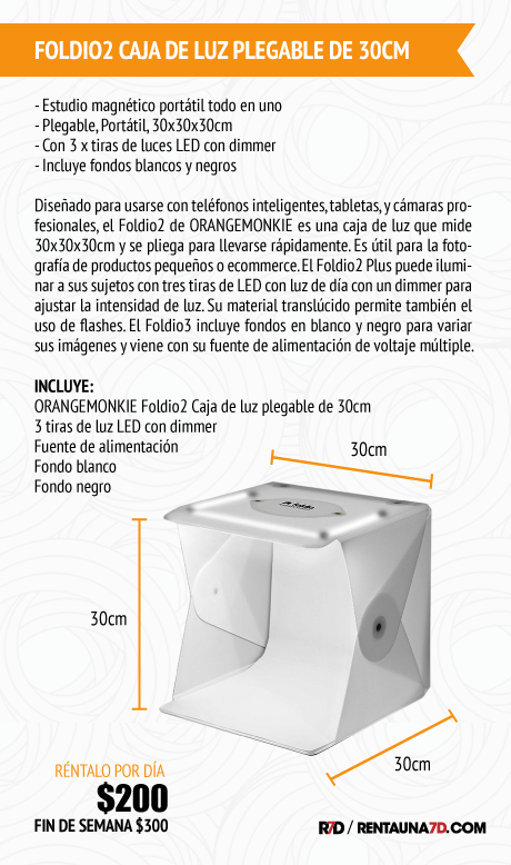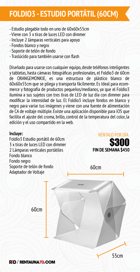 Diseñado para usarse con cualquier equipo, desde teléfonos inteligentes y tabletas, hasta cámaras fotográficas profesionales, el Foldio3 de 60cm de ORANGEMONKIE, es una estructura de plástico blanco de 60x60x55cm que se pliega y transporta fácilmente. Es Ideal para ecommerce y fotografía de productos pequeños/medianos, ya que el Foldio3 ilumina a sus sujetos con tres tiras de LED de luz día con dimmer para modificar la intensidad de luz. El Foldio3 incluye fondos en blanco y negro para variar tus imágenes y viene con una fuente de alimentación de CA de voltaje múltiple. Existe una aplicación disponible para iOS que facilita el ajuste del croma, brillo, control de la temperatura del color, la edición y el uso compartido en la web.