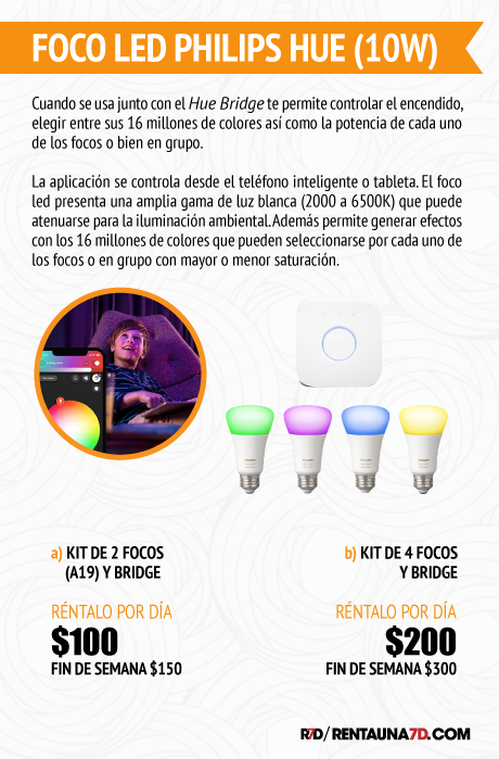 Cuando se usa junto con el Hue Bridge te permite controlar el encendido, elegir entre sus 16 millones de colores así como la potencia de cada uno de los focos o bien en grupo. La aplicación se controla desde el teléfono inteligente o tableta. El foco led presenta una amplia gama de luz blanca (2000 a 6500 K) que puede atenuarse para la iluminación ambiental. Además permite generar efectos con los 16 millones de colores que pueden seleccionarse por cada uno de los focos o en grupo con mayor o menor saturación.