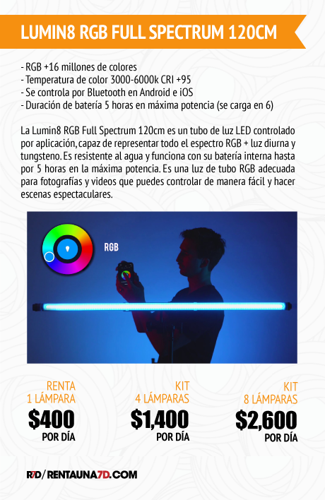 La Lumin8/Luxceo RGB Full Spectrum 120cm es un tubo de luz LED controlado por aplicación, capaz de representar todo el espectro RGB + luz diurna y tungsteno (3,000-5,700k). Es resistente al agua y funciona con su batería interna hasta por 5 horas en la máxima potencia. Es una luz de tubo RGB adecuada para fotografías y videos que puedes controlar de manera fácil y hacer escenas espectaculares.