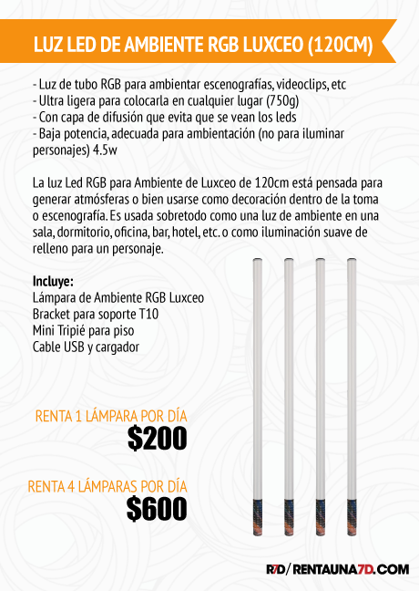 La luz Led RGB para Ambiente de Luxceo de 120cm está pensada para generar atmósferas o bien usarse como decoración dentro de la toma o escenografía. Es usada sobretodo como una luz de ambiente en una sala, dormitorio, oficina, bar, hotel, etc. o como iluminación suave de relleno para un personaje.
