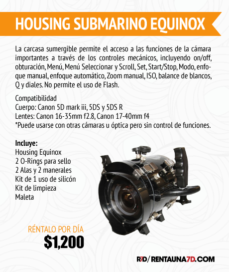 La carcasa sumergible permite el acceso a las funciones de la cámara importantes a través de los controles mecánicos, incluyendo on/off, obturación, Menú, Set, Start/Stop y diales.