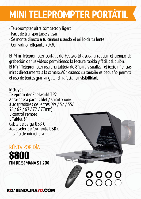 El Teleprompter se adapta al lente de tu cámara con alguno de sus ocho anillos adaptadores: 49 / 52 / 55 / 58 / 62 / 67 / 72 / 77mm ( es recomendable quitar filtros como el UV para evitar fricción entre los arillos).