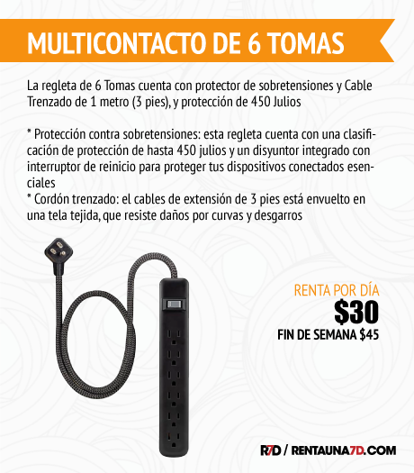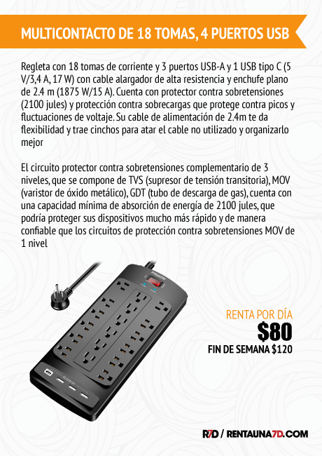 Regleta con 18 tomas de corriente y 3 puertos USB-A y 1 USB tipo C (5 V/3,4 A, 17 W) con cable alargador de alta resistencia y enchufe plano de 2.4 m (1875 W/15 A). Cuenta con protector contra sobretensiones (2100 jules) y protección contra sobrecargas que protege contra picos y fluctuaciones de voltaje. Su cable de alimentación de 2.4m te da flexibilidad y trae cinchos para atar el cable no utilizado y organizarlo mejor